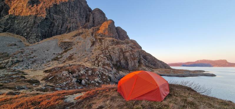 Frokost på sengen får en litt annen betydning, når det er en slik utsikt mens vannet til kaffen koker. Lyden av kokeapparatet, svak bris i teltduken og bølgeskvulp er som balsam for sjelen.