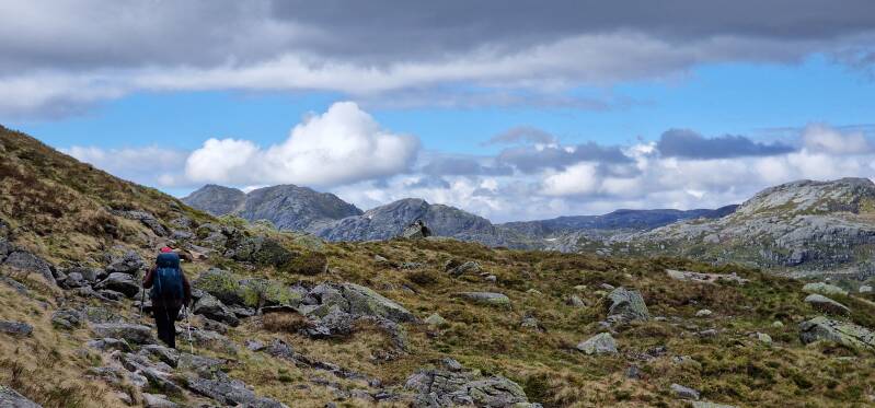 Etter å ha ryddet og rengjort hytten etter oss, var det klart for å spenne på sekken igjen. Kroppen kjentes god, men etter få meter ned skråningen fra Blåfjellenden meldte det vanlige problemet seg; høyre storetå var ikke helt fornøyd. Etter en strammerunde på sko, etter bare 10 minutter, så var jeg klar.