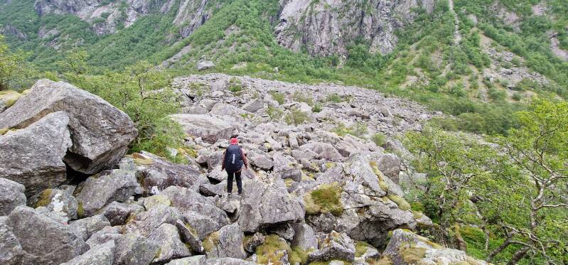 Men først måtte vi tråkke oss gjennom fjellsiden som går langs Månsvatnet. Det er beskrevet mange steder at det går an å gå på østsiden av Månsvatnet, og på den måten slippe den store steinura. Minuset med et slikt rutevalg er at man må krysse elven der den går ut i Månsvatnet, noe som ikke er å anbefale ved stor vannføring. Slik vi oppfattet vannføringen da vi gikk turen, var det helt uaktuelt å krysse elva til fots, så da ble det den "vanlige" ruten mot steinuren.