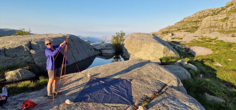 Siden det var litt fuktig i bakken stort sett over alt der vi ville ha satt opp teltet, så endte vi med å prøve oss på fjell. Noe som skulle vise seg å fungere helt utmerket.