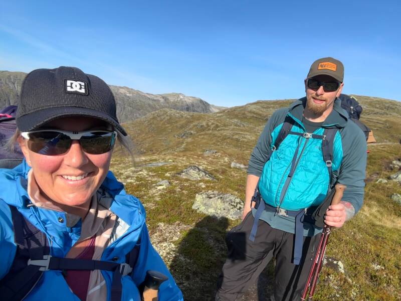 Siste stykket før toppen syns jeg var litt tungt. Sekken var litt tung, og klærne mine holdt ikke helt stand mot regnet. Jeg gikk med en eldre Stormberg-jakke som hadde god vannsøyle (30.000), men etter mange års bruk hadde den nok gjort sitt med tanke på motstand mot regn. Jeg var rett og slett blaut helt inn til skinnet. Vi gikk begge med ulltrøyer, men hver gang jeg stoppet opp litt tok det ikke lange tiden før jeg ble kald. Det var best å bare holde meg i bevegelse.