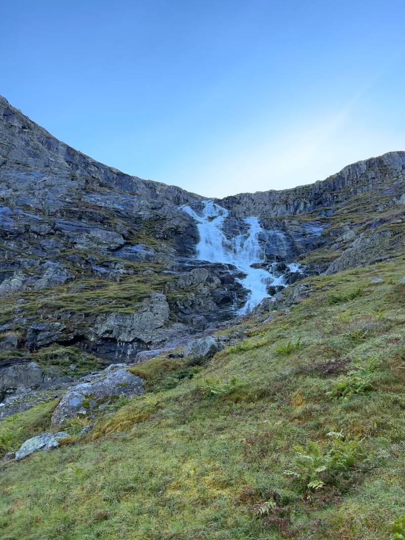 Når vi nærmet oss bunnen av Øvredalen kom vi til fossefallet som hadde utspring fra Trollebottsvatnet. Vannet hadde godt med kraft, og uten broene som var lagt ut hadde vi nok ikke kommet oss over. Broene var av det litt vinglete slaget, så her fikk vi kjent litt på balansen. Det var helt greit å komme seg på sikker grunn, og gå videre nedover Øvredalen.
