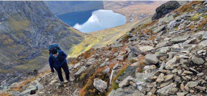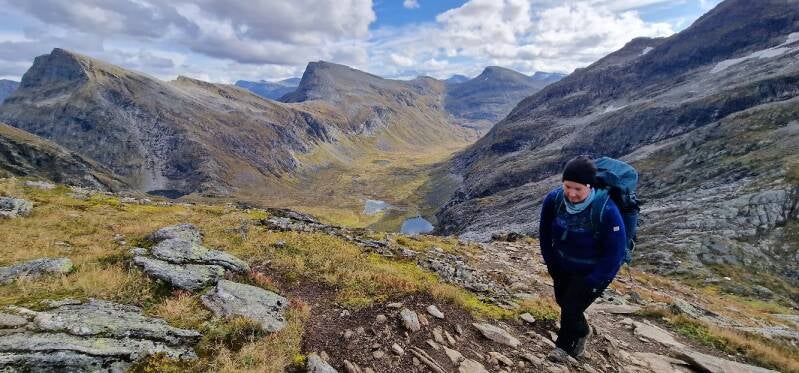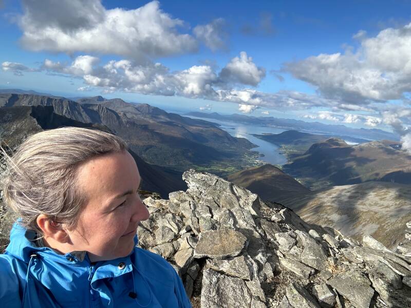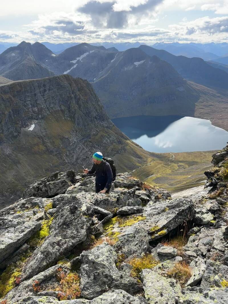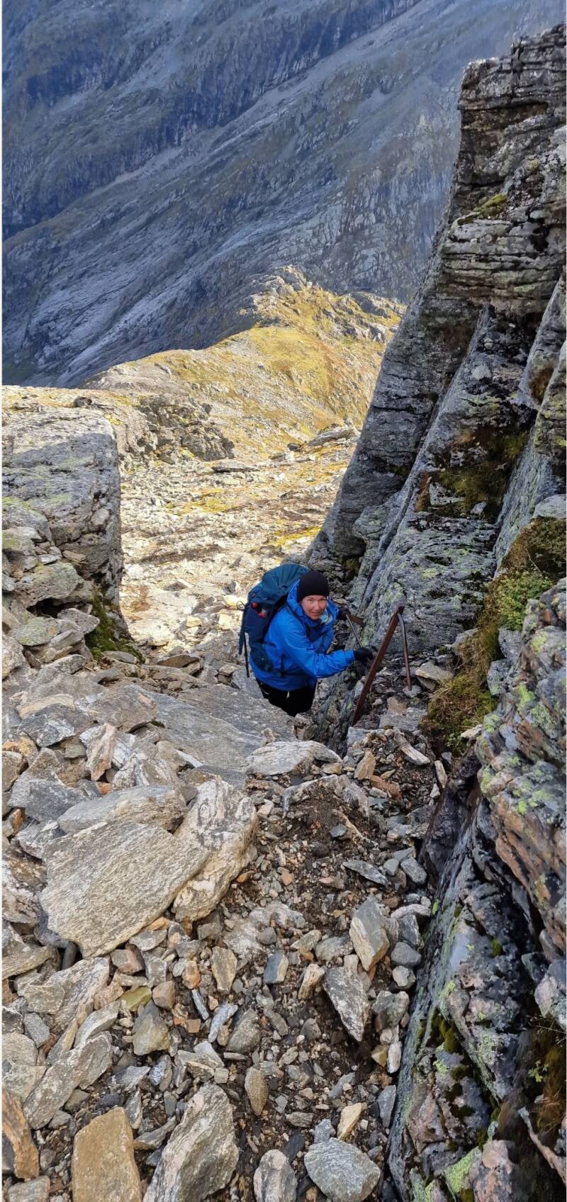 Oppover fjellsiden var det et nettverk av rotete stier og tråkk, så det å følge én sti var nært sagt umulig. Jeg forsøkte å blinke ut veivalg oppover som så passe trygge ut, men bommet flere ganger der jeg måtte klyve inn på en annen sti for å ikke være så eksponert i fjellsiden. Brit Elin lå et hakk forran hele tiden, og så ut til å stortrives. Jeg var bittelitt mer engstelig. Mulig det var irrasjonell frykt, og muligens var jeg såpass sliten at hodet spilte meg et puss. Men til tross for litt skepsis på veien, så klarte jeg nyte oppturen til de grader.