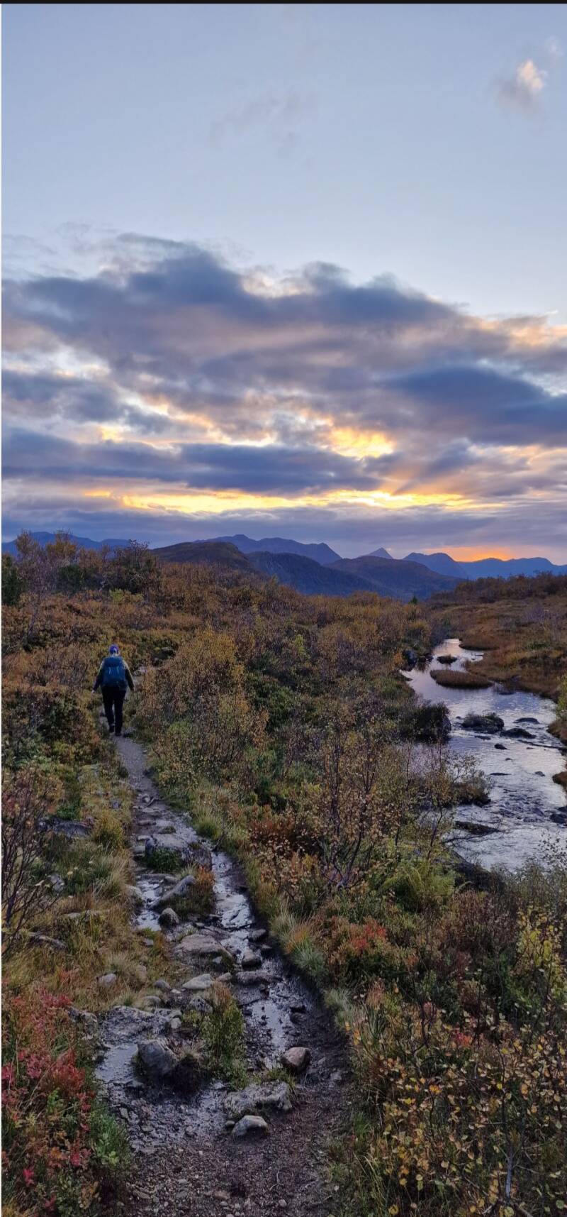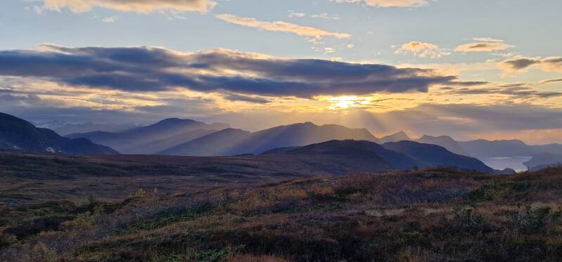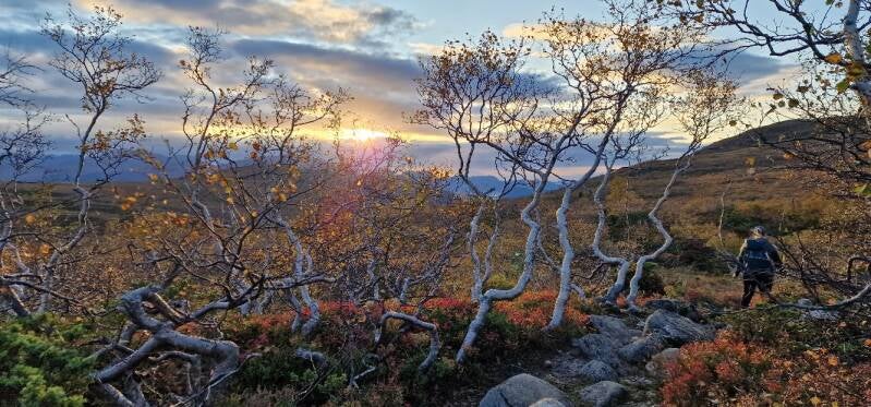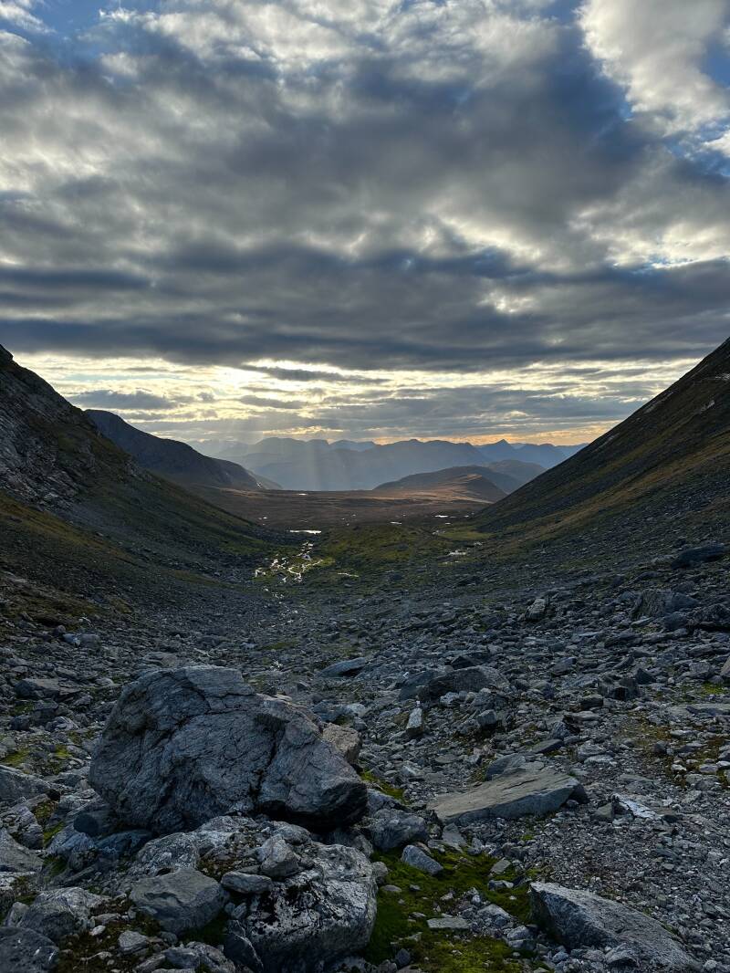 Vi kom etter en stund ned til krysset, der jeg satte fra meg stavene. Vi tok en liten pause der, og kikket oss tilbake opp mot toppen. Det var gøy å tenke at vi hadde kommet oss opp, og det var ganske godt å ha kommet ned igjen også. Nå gjenstod egentlig bare vandringen ned mot Grytavatnet, og i det vi gikk nedover fikk vi ettermiddagssolen rett imot. Noe mer eventyraktig skal man lete lenge etter.