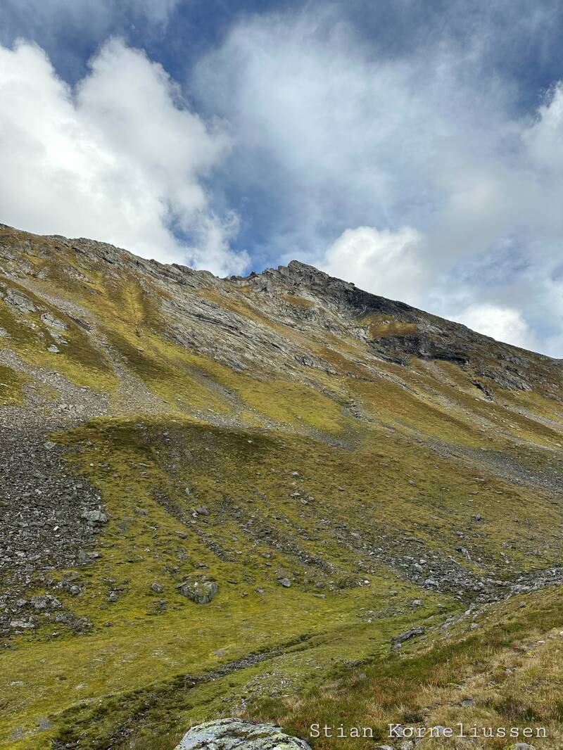 Bilder er noen ganger ikke beskrivende nok. Her er kamera rettet mot toppen av Lauparen, men det er ikke toppen vi ser fra skaret. Også er det fryktelig bratt opp denne fjellsiden.