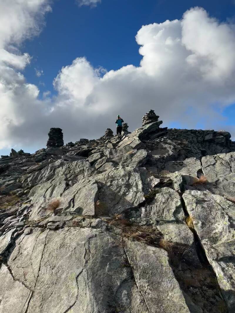 Vi tok en pust i bakken og litt drikke i krysset. Brit Elin kunne merke at jeg var betenkt, og vi tok en kjapp sjekk på FatMap og Ut.no. Brit Elin var sikker på at dette kom til å gå helt fint tidsmessig, og ga meg både oppmuntrende ord og en god klem. Akkurat det jeg trengte for å gyve løs på motbakkene. Jeg bestemte meg for å legge igjen stavene mine ved varden. Det så såpass bratt ut videre at jeg tenkte staver bare ville være i veien. Nå var det klyving med hendene som gjaldt.