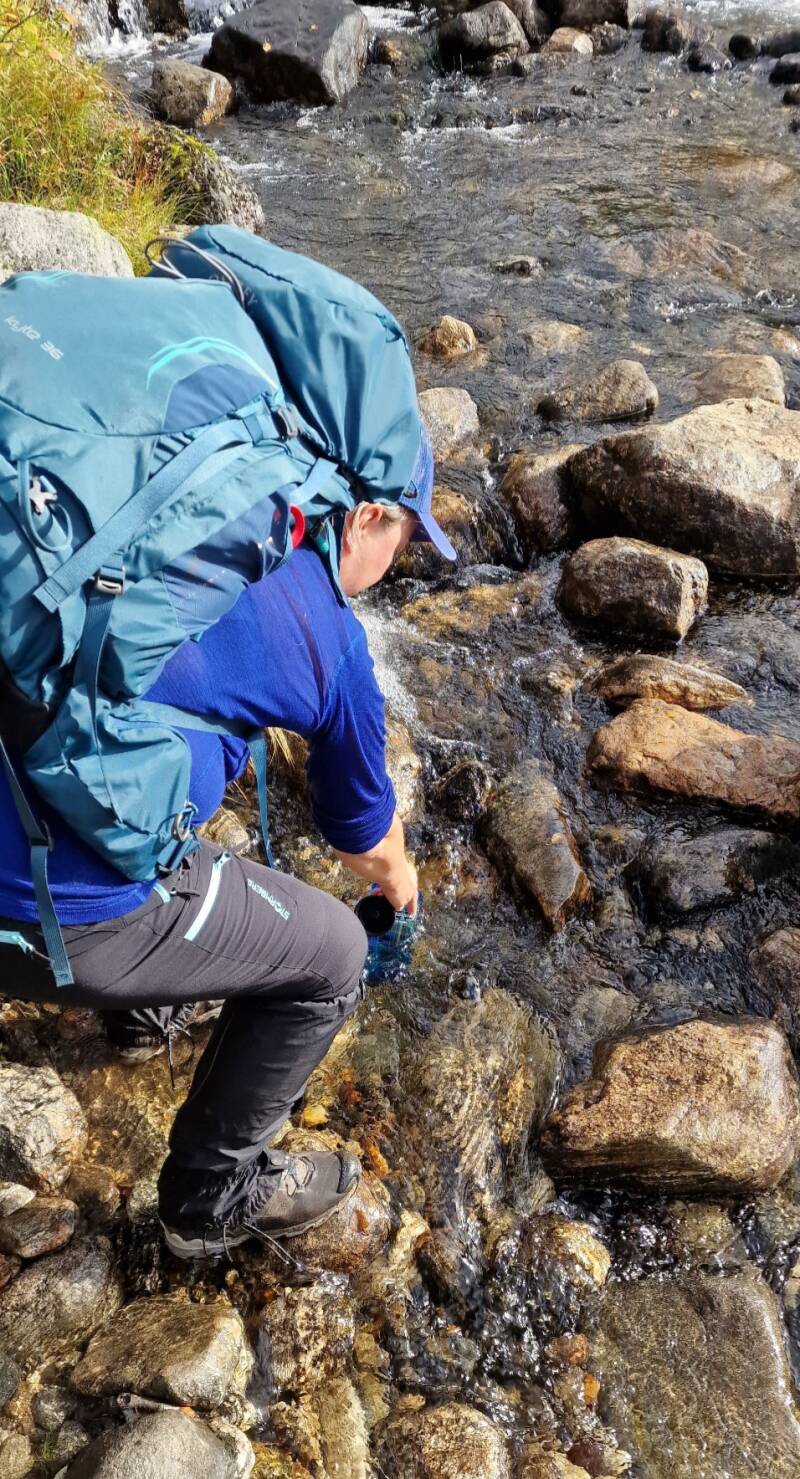 Da vi kom opp til Grytalivatnet var det en naturlig stoppeplass ved en stor kampestein. Her ble det en liten rast for å spise en bit med snacks og fylle på væskelageret. Jeg ble stående å kikke ned mot vannet, og kunne godt ha plasket ut i dette slik temperaturen var. Lua og fleecen hadde for lengst røket bak i sekken, og det føltes som om sommeren gjorde et comeback i det vi nå gikk inn i en del av stien som begynte å stige.