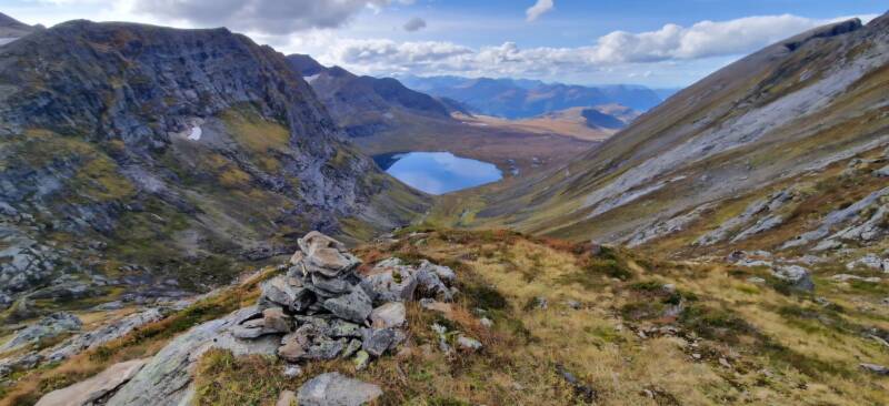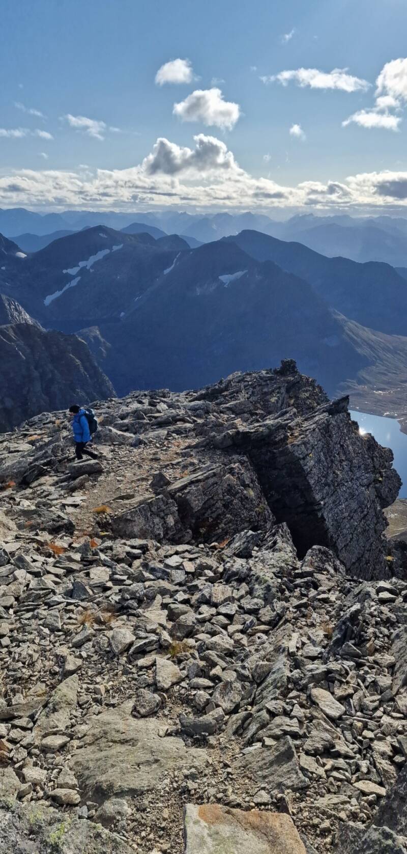 Ikke så langt unna toppen klarte vi å rote oss inn på en feil avstikker av ruten opp. Det var enkelte steder litt dårlig merket oppover, så jeg sjekket kartet flere ganger. Vi så det gikk et tråkk rett over et helt sprøtt brattheng, der stien gikk i løsmasse og løse steiner. Vi ble enige om å gå én om gangen over. Vi trengte jo ikke falle ned begge to liksom. Vi kom oss greit over, men så stod vi der og lurte på hvor det ble av stien igjen. Jeg tok meg opp på en slags hylle, og til min store forskrekkelse var det bare rett ut i det store intet på andre siden. Jeg satt tydeligvis på en egg og på andre siden gikk det sikkert 6-700 meter rett ned. Jeg trakk meg rolig tilbake til Brit Elin og sa litt tørrvittig "jeg tror ikke vi skal denne veien". Så da måtte vi over bratthenget igjen - én og én - for å se hvor vi hadde gått feil.