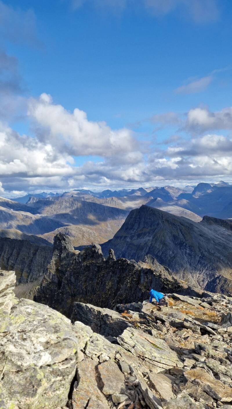 Stykket fra skaret og opp til toppen er noe av det verste og beste jeg har opplevd på mine år som fjellgeit. "Verst" på den måten at jeg aldri har gått i så bratt terreng før. Det var til tider såpass bratt at jeg kunne stå delvis oppreist, strekke armene rett ut foran meg og ta i bakken. Jeg husker at jeg tenkte på turbeskrivelser om lauparen, der det stod at denne turen ble gått av barnefamilier. Det var jo helt absurd! Jeg gikk på det verste og tenkte, hvis jeg tråkket feil eller skled her så var det over og ut. Men så var det samtidig et helt sprøtt skue rundt oss. Jeg måtte ta litt pauser, og benyttet anledningen til å suge inn de utrolige inntrykkene.