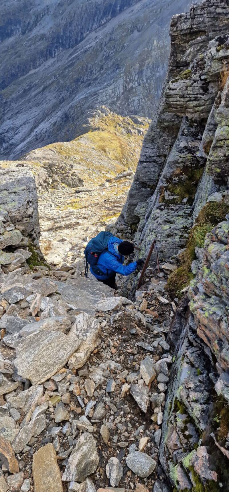 I de fleste tilfeller er nedturen fra toppturer ganske greie. Det går tross alt nedover, og man blir sjelden svært sliten på vei ned. Det kjennes som oftest i knær og lår, men totalt sett er nedover lettere. Nedturen fra Lauparen var en litt annen utfordring enn det jeg er vant med. Det var jo styggbratt oppover, og nå skulle vi gå samme veien ned igjen. På vei opp hadde jeg lagt merke til at underlaget i stiene kun var løsmasse av stein, sand og jord. Det bekymret meg litt i det jeg klatret ned ved det oppsatte gelenderet.