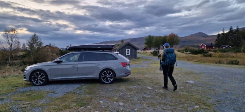 Vel fremme på parkeringen var det ut med det vi trengte av utstyr og klær. Vi har som regel ikke pakket sekkene helt ferdige når vi parkerer ved turene sine utgangspunkt. Jeg syns det er greit å se an både været, temperatur og ikke minst landskapet før jeg tar siste pakkerunde av sekken. Denne dagen var det perfekt turvær; opphold, lettskyet og antydning til sol. Dette kombinert med god september-luft er for meg det ultimate "tur-klima". For all del - sommer i fjellet er herlig det også, men å gå toppturer med halvtung sekk i 28 - 29 varmegrader er mildt sagt klamt og ubehagelig.