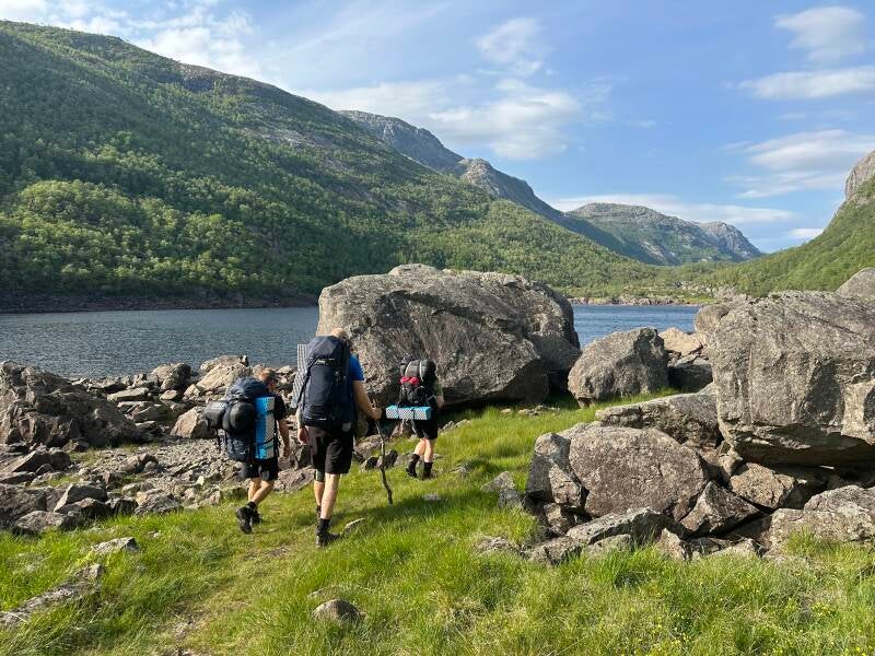 Godt humør, godt selskap og herlig sommervarme på vei mot nattens camp.
